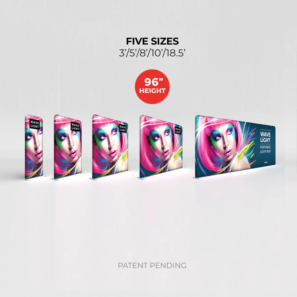 The WaveLight® Backlit Display is available in 5 sizes - 3ft (36”w x 96”h), 5ft (62”w x 96”h), 7.5ft (88’w x x96”h), 10ft (114”w x 96”h) and 18.5ft (218”w x 96’h).